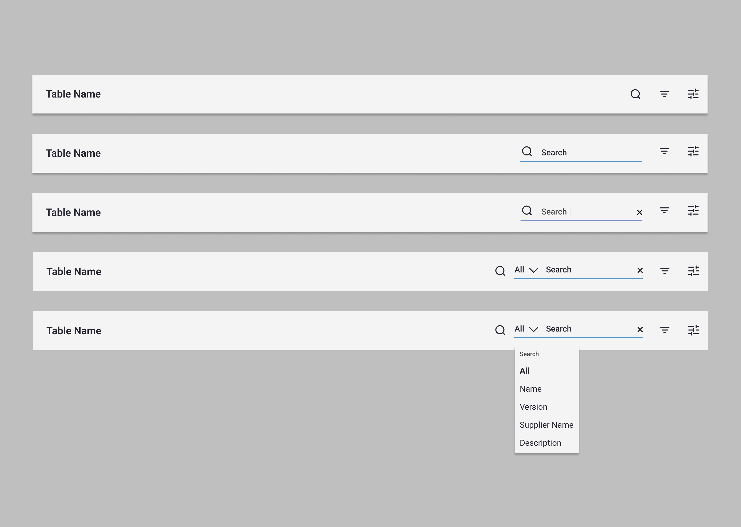 Search functionality is an essential feature for usability in enterprise data table design. As enterprise data tables often contain much information, search functionality allows users to quickly and easily find the needed data without scrolling through large amounts. Including this design pattern gives users efficiency, precision, and flexibility in their search.